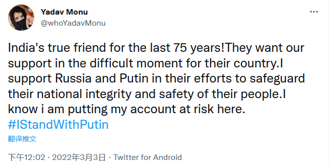 有人称冒着被“封号”的危险也要仗义执言:“(俄罗斯是)印度过去75年里真正的朋友!我支持俄罗斯和普京努力维护他们的国家主权和人民安全。我知道说这话会让我的账户置于危险之中。”