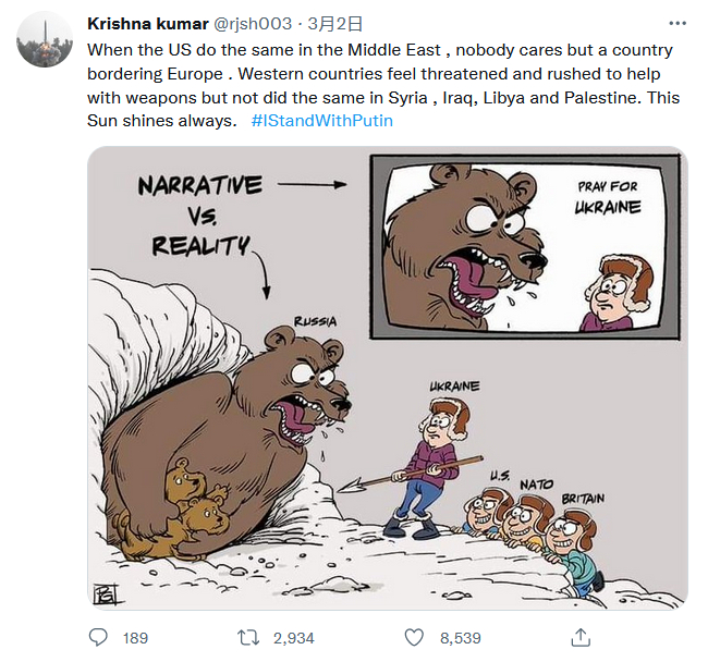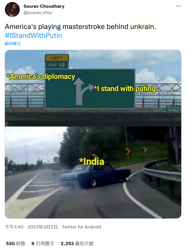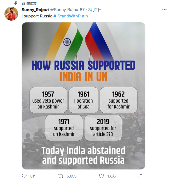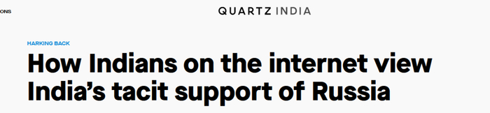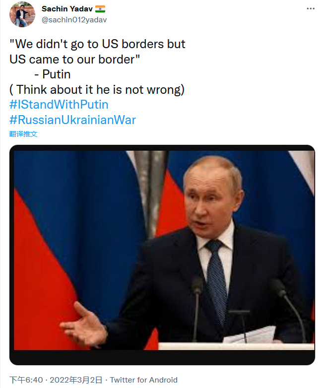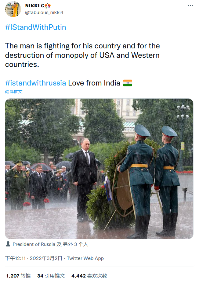 而且在这一部分声音中,印度网民的存在感极强。报道称,使用这些口号的推特用户中绝大部分来自印度,他们指出俄罗斯和普京都是在反抗西方,作为印度人应该支持他们的老朋友,并维持与俄罗斯的外交和国防关系。