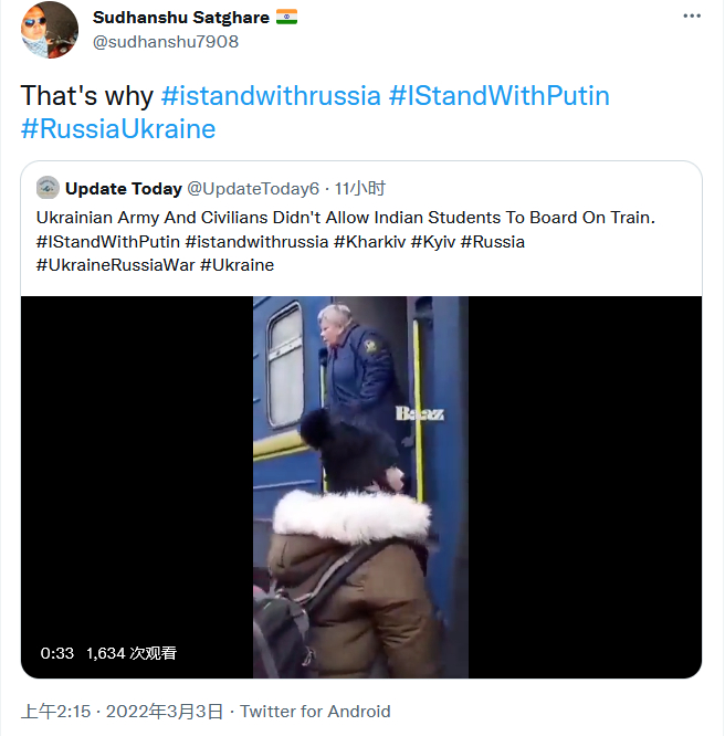 还有人更提到,有印度公民最近在撤离乌克兰时遭到当地人的歧视性对待,印度留学生在边境还遭到乌克兰军警折磨。