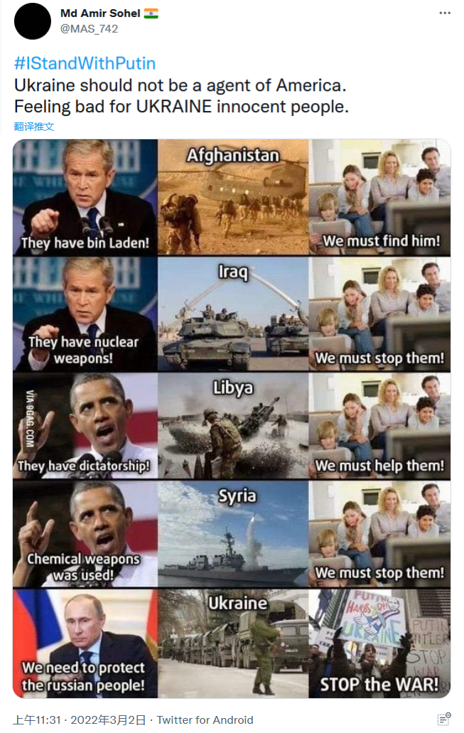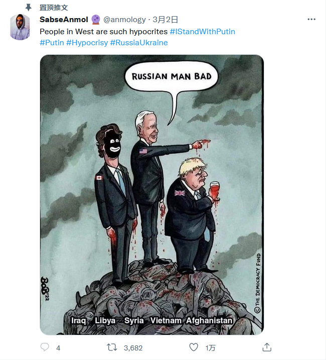 还有印度网民表示,西方多次肆无忌惮地入侵阿富汗和其他中东国家,现在却竖起道德标杆批评俄罗斯,是一种虚伪且双标的无耻行为。“美国和北约摧毁了9个伊斯兰国家,杀害了1100万人,没有人称他们为恐怖分子。”