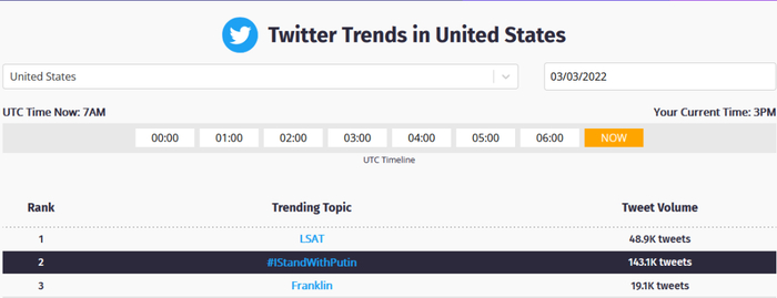 截至发稿前,“我支持普京”等tag已经登上了12个国家及地区的推特热门趋势,其中全球榜为第25名,印度榜第1名。今天(3日),这一tag还“杀”进了西方国家的推特趋势,高居美国榜第2名,澳大利亚榜第3名,英国榜第8名,加拿大第9名。