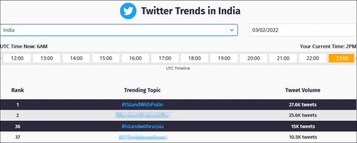 印度推特热门趋势上,“我支持普京”最高排到榜首,“我支持俄罗斯”为第36名