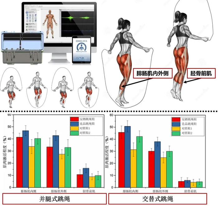 跳绳运动下肢肌电激活研究:采集测试过程中下肢腓肠肌内外侧、胫骨前肌的平均肌肉激活水平,用于评估肌肉兴奋程度及肌纤维募集水平