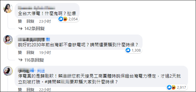 还有众多网民在停电事故后涌到蔡英文脸书评论区,愤怒质问:“说好的2030年前台湾都不会缺电呢?民进党还要骗到什么时候?”