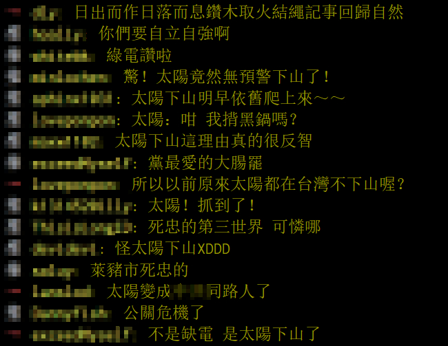 台电的回应遭到了众多岛内网民的嘲讽吐槽,“太阳下山这理由真的很反智。”“太阳:我背锅吗?”