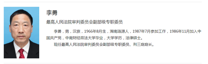 2009年12月,李勇成为最高法刑一庭副庭长,2017年12月任最高人民法院刑三庭庭长。