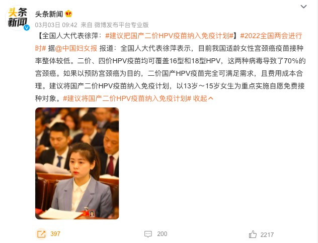 保护率和性价比突出,人大代表建议推广国产HPV疫苗