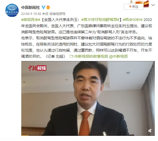 2022年全国两会期间,全国人大代表、广东国鼎律师事务所主任朱列玉提出,建议取消醉驾型危险驾驶罪。这已是他连续第二年为“取消醉驾入刑”奔走呼告。