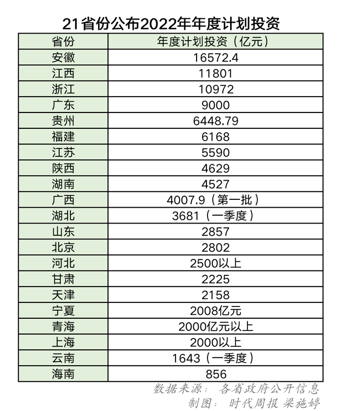 目前已公布年度计划投资的21个省份中,共有7个省份的年度计划投资超过5000亿元,分别是安徽、江西、浙江、广东、贵州、福建、江苏。