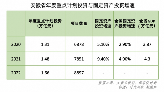时代周报记者梳理发现,近三年来,安徽省的年度重点计划投资均在1万亿元以上,是名副其实的投资大户。
