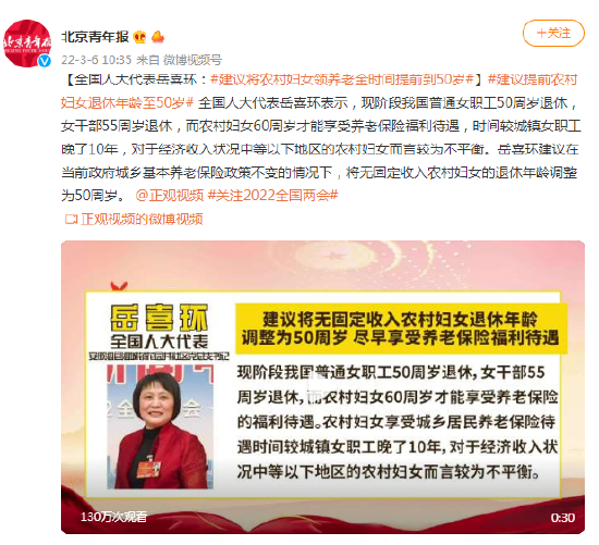 全国人大代表岳喜环表示,现阶段我国普通女职工50周岁退休,女干部55周岁退休,而农村妇女60周岁才能享受养老保险福利待遇,时间较城镇女职工晚了10年,对于经济收入状况中等以下地区的农村妇女而言较为不平衡。岳喜环建议在当前政府城乡基本养老保险政策不变的情况下,将无固定收入农村妇女的退休年龄调整为50周岁。