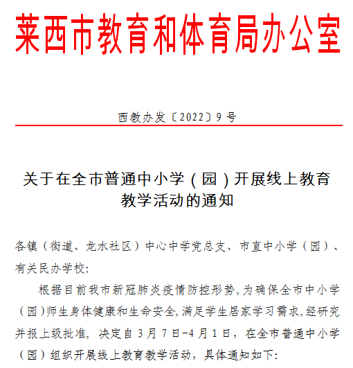 莱西市教育和体育局办公室2022年3月6日发布《关于在全市普通中小学(园)开展线上教育教学活动的通知》,通知指出:根据目前我市新冠肺炎疫情防控形势,为确保全市中小学(园)师生身体健康和生命安全,满足学生居家学习需求,经研究并报上级批准,决定自3月7日-4月1日,在全市普通中小学(园)组织开展线上教育教学活动。相关内容如下: