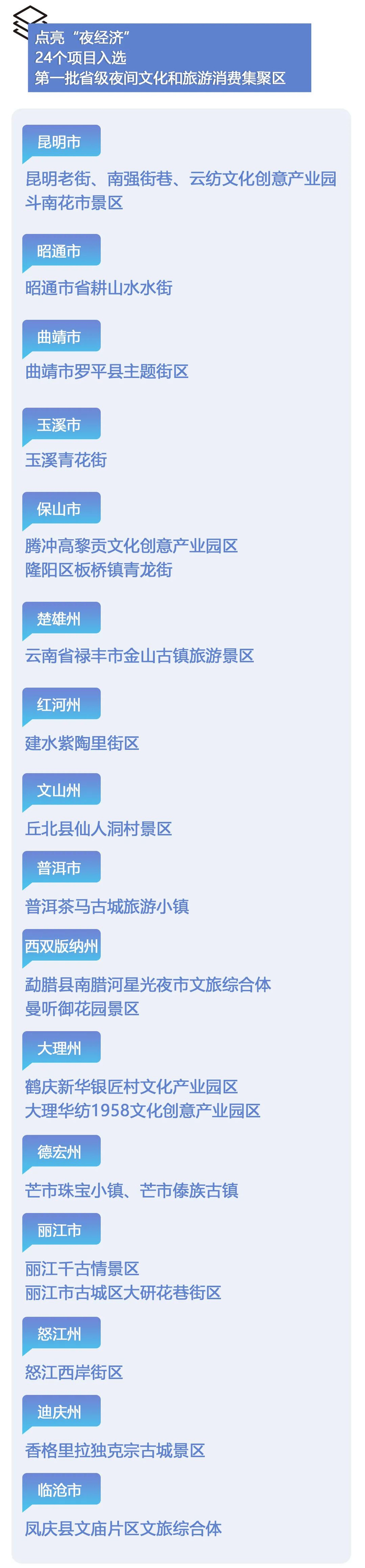 夜间文化和旅游消费集聚区是文化和旅游消费的新场景,也是城市活力的新标志。《云南省培育发展新型消费释放消费潜力三年行动方案(2021—2023年)》明确,大力创建国家文旅消费示范城市和试点城市,开展国家级、省级文旅融合示范区、夜间文旅消费集聚区和文化产业园区建设,到2023年底建成25个省级文旅融合示范区、夜间文旅消费集聚区。让夜经济成为拉动城市消费的新引擎,需要耐心培育与引导。《云南省人民政府办公厅关于促进夜间经济发展的指导意见》提出十项主要任务,包括加强规划引领,完善夜间经济区域空间布局;丰富消费业态,增加夜间文化旅游产品供给;鼓励延时经营,便利居民夜间生活消费等。