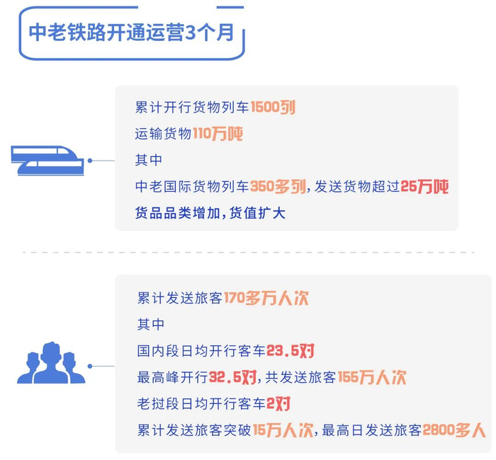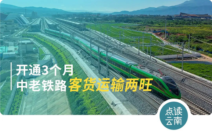 3月3日,中老铁路开通运营3个月,人享其行,物畅其流,客货齐旺,共发送旅客170多万,运输货物110万吨,以昆明为集结地的中老铁路国际货物列车加密开行,呈现良好态势。