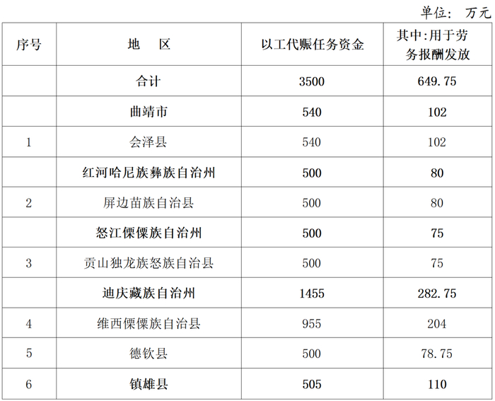 日前,云南省财政厅下达2022年省级财政衔接推进乡村振兴补助资金(以工代赈任务),本次下达资金合计3500万元,其中649.75万元用于劳务报酬发放。通过实施以工代赈,项目县农村困难群众可实现家门口就业增收,改善当地生产生活条件,进一步巩固脱贫攻坚成果,夯实乡村振兴基石。