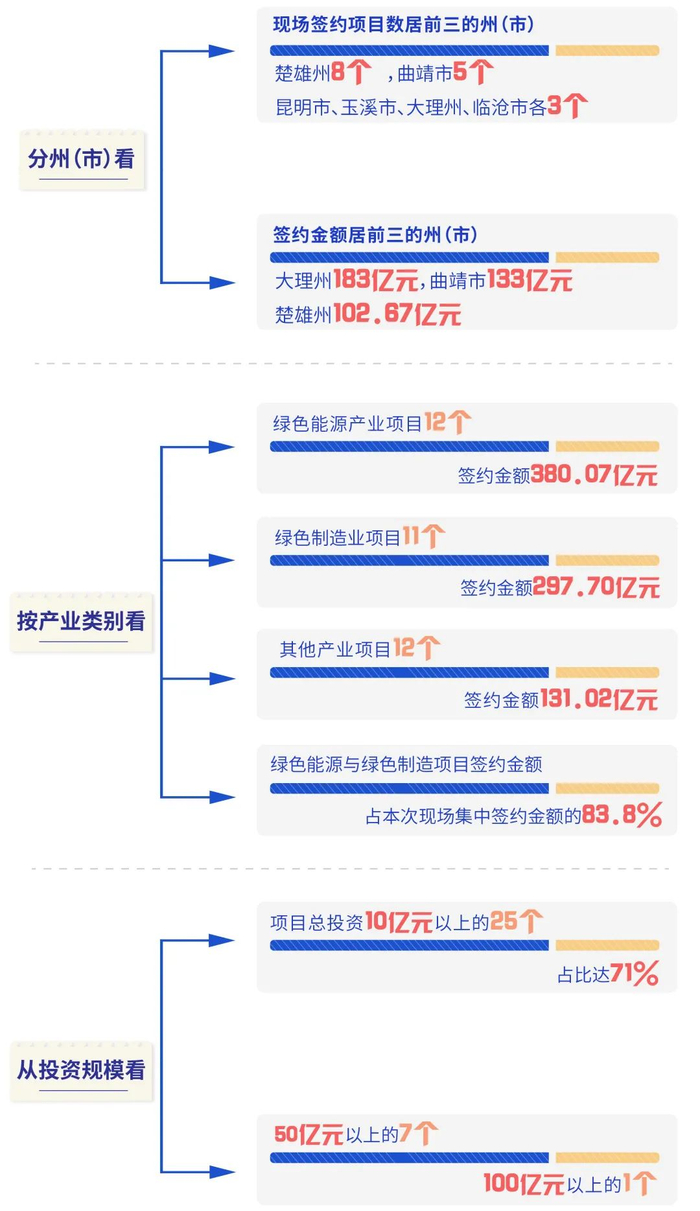 近日,云南省14个州市主要领导和60余家企业齐聚滇池畔,共同见证了云南省绿色能源与绿色制造融合发展招商合作暨一季度产业项目集中签约。本次集中签约62个项目,涉及全省14个州市,总金额达1100亿元。其中,35个项目在活动现场进行集中签约,总金额超800亿元,内资项目33个,外资项目2个,投资规模平均超过20亿元。