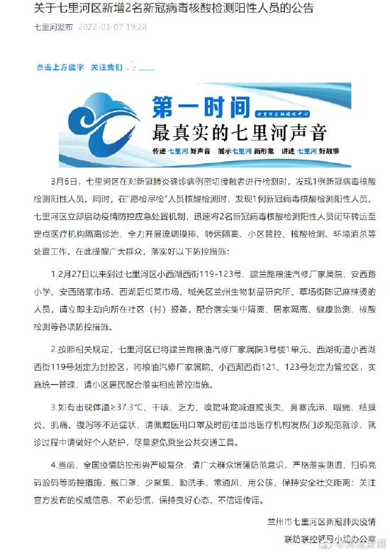 1、2月27日以来到过七里河区小西湖西街119-123号、建兰路粮油汽修厂家属院、安西路小学、安西路菜市场、西湖后街菜市场、城关区兰州生物制品研究所、草场街陈记麻辣烫的人员,请立即主动向所在社区(村)报备,配合落实集中隔离、居家隔离、健康监测、核酸检测等各项防控措施。