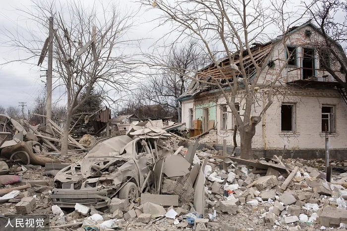 当地时间2022年3月5日,乌克兰Markhalivka,当地靠近首都基辅,在冲突中遭到炮击,多处房屋和建筑遭到损毁,遍地狼藉。