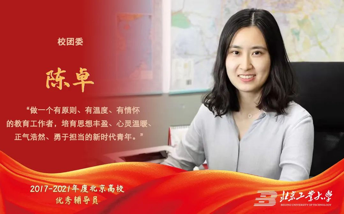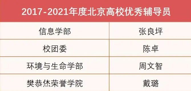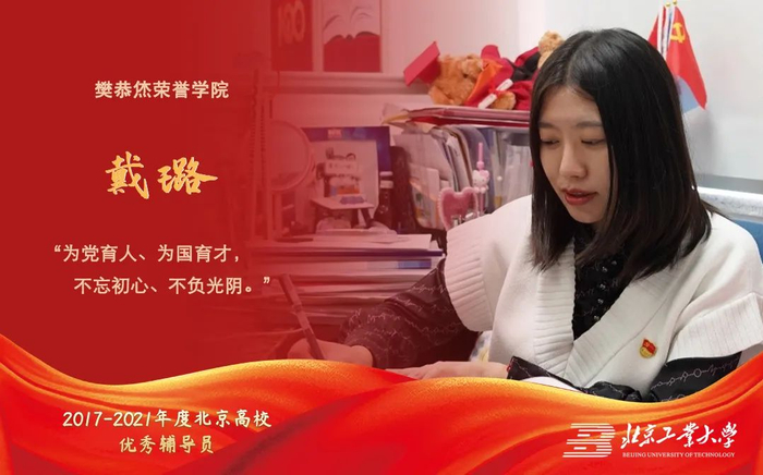 戴璐担任辅导员以来,积极践行党团班宿一体化建设,所带本科生班级连续三年获得北京市先进班集体、校级十佳班集体、五四标兵团支部等16项集体荣誉称号,其中180001班荣获2020北京高校“我的班级我的家”十佳班集体第一名以及2021年全国高校“活力团支部”称号。班级学生英语四级、六级通过率均为100%,学生累计获得各类省部级以上科技竞赛奖励94项,发表SCI、EI论文9篇。毕业生前往清华大学、帝国理工学院等QS排名前100以及学科评估A以上的院校占比达60%以上。