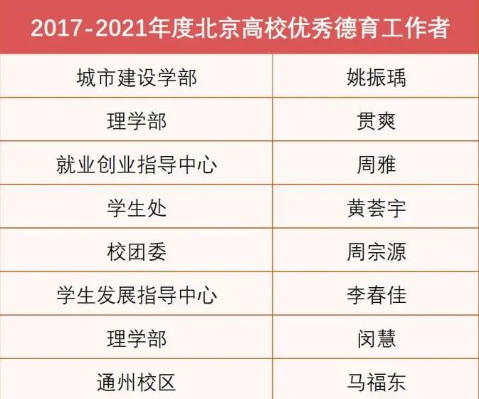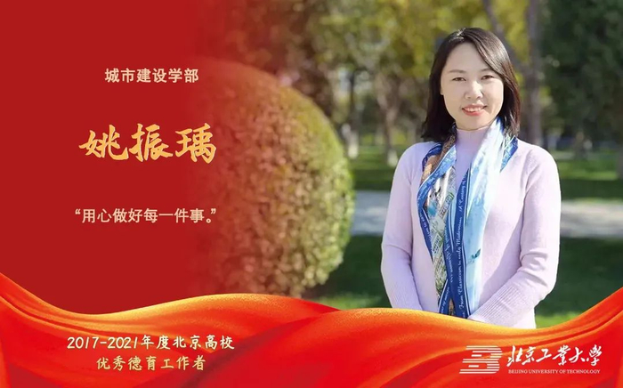 姚振瑀作为高校思政一线的教育工作者,肩负使命担当,凝聚奋进力量,坚守立德树人初心,担当筑梦育人使命。开拓创新,凝练多项特色工作法,带领工作团队取得骄人成绩,所在学部党委获批全国党建工作标杆院系、“三全育人”综合改革试点院系,教师党支部获批 “全国党建工作样板支部”,学生党支部获批全国高校“百个研究生样板党支部”。指导学生多次在全国“互联网+”“挑战杯”“创青春”等国际国家级龙头科技赛事中获得金奖,多项赛事成绩实现北京市属高校“零”的突破,用实际行动诠释一名高校德育工作者的初心与使命。