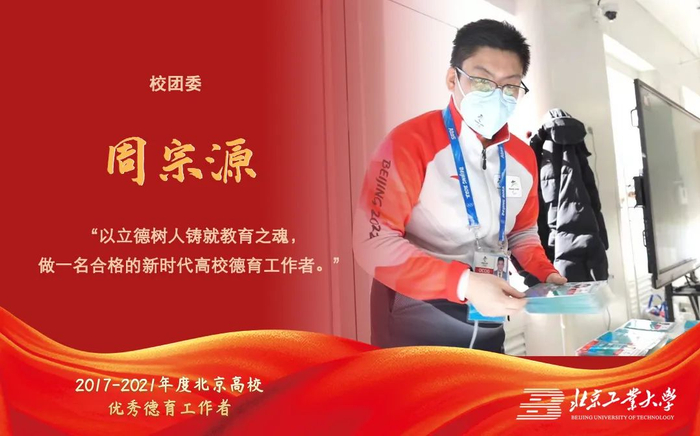 周宗源长期奋战在学生工作一线。工作中,深入推进基层党团组织建设,加强团学干部培养。始终以立德树人教育为根本,积极推进三全育人体系,服务学生成长。自2021年6月至今,周宗源同志借调至北京冬奥村(冬残奥村)。负责志愿者管理工作,完成884名冬奥志愿者招募选拔工作,服务涉及 27 个业务领域的 52 个岗位。组织开展志愿者培训工作。