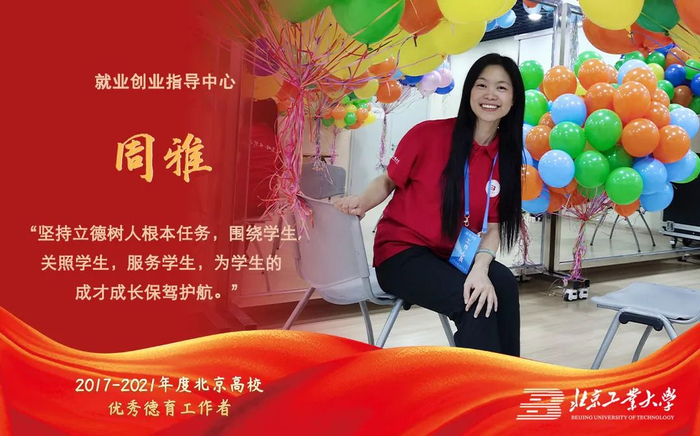 周雅从事学生工作十余载,不断探索学校研究生党建和思想政治教育新形式,自2019年起首次组建校研究生宣讲团,组织宣讲团成员累计开展校内外宣讲100余次,以朋辈的视角和青年之声,传递坚定的爱国奋斗精神。参与组织学校科技节、开学典礼、毕业典礼等大型活动,协助部门承担了国庆70周年庆祝活动临时党委的筹备、组织和实施,并参加了国庆70周年庆祝活动群众游行“建国伟业”方阵。参与策划和组织学生返校、毕业生行李打包、新生接站等学生疫情防控工作。2018年5月-2021年12月曾任党委研究生工作部办公室主任。