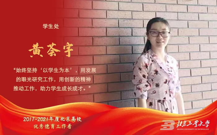 黄荟宇积极探索学生党建“三个引航”工作模式、开展“三力教育”工程,做到学生党员教育100%全覆盖,在红色“1+1”示范项目中5次获得优秀活动组织奖。所在队伍循序深化思政教育,荣获北京市思想政治工作优秀单位、首都大学生思想政治教育工作实效奖一等奖等多项荣誉。推荐的优秀班集体连续九年荣获北京市“十佳示范班集体”荣誉称号。队伍建设塑品牌,助推辅导员队伍专业化,工作成果获北京高等学校党的建设和思想政治工作优秀成果二等奖。