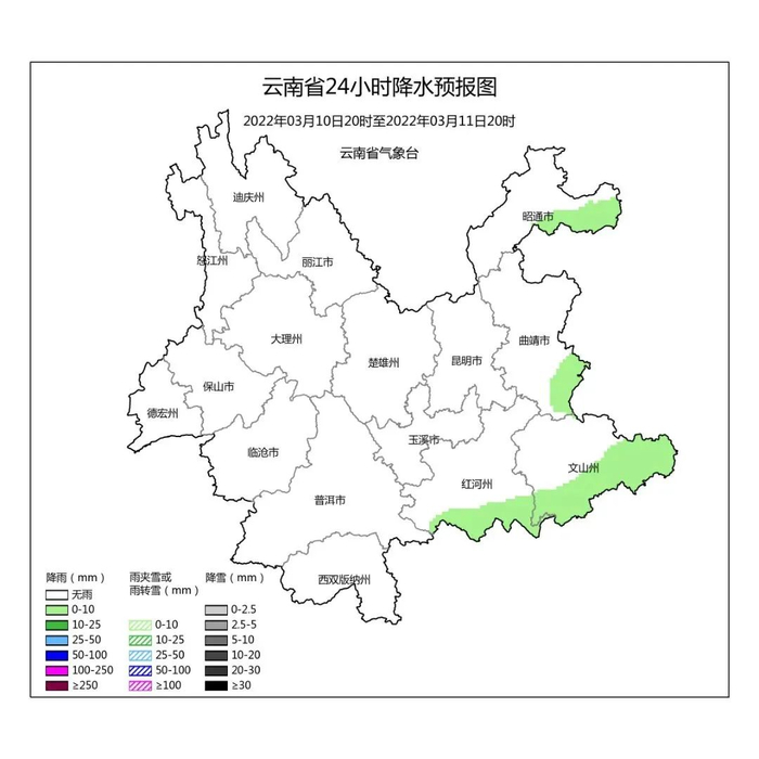 3月10日20时到3月11日20时:昭通北部、曲靖东部、文山南部、红河南部多云局部有阵雨,其他地区晴。