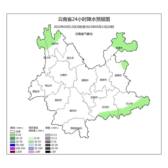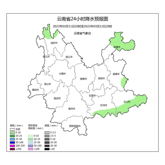 3月11日20时到3月12日20时:昭通北部、曲靖东部、文山南部、红河南部、迪庆北部多云局部有阵雨,其他地区晴。