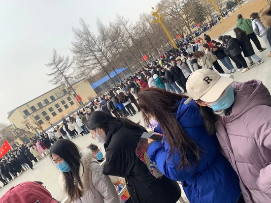 吉林农业科技学院当时还没有筛查出阳性病例,所以3月4日这天采取的是混采方式。当天上午8点多,张静和室友来到测试地点,也就是九站校区的体育馆,发现现场“就像菜市场,人挤人”,一条长长的队伍从体育馆内部延伸到了外面的空地,“把大学生活动中心绕了一圈,又把S楼绕了一圈。”她随手拍了张照片,照片里,不少人还穿着厚厚的羽绒服。虽然已值冬末,但北方的空气里还透着寒气。