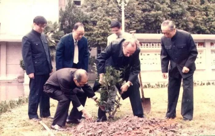 当时栽树的德方代表是德国海德堡大学校方代表、德中医学协会理事长盖尔哈特教授(中),蹲下身扶着树苗的正是原同济医科大学名誉校长裘法祖院士。