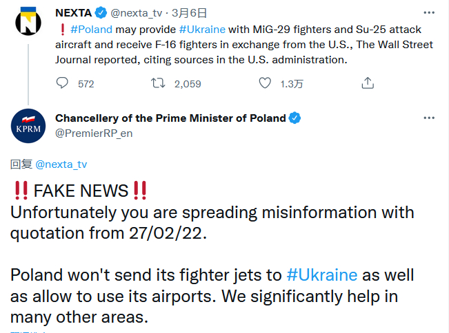 2月27日,坊间流传消息:美国暗中策划将波兰、斯洛伐克、保加利亚的米格-29“赠送”乌克兰,美国用二手F-16替换。3月1日,三国政府公开否认。3月3日和6日,波兰军方和波兰总理再次否认。但3月6日,布林肯在CBS访谈中公开承认正在与盟国协调、运作这事。泽连斯基高调谴责各国拖沓,乌克兰国防部在2月28日就宣布,东欧米格-29将以波兰为基地,飞行员正在波兰接受训练。