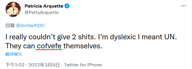 有美媒发现,她在回复网友时写了个拼写错误的词“cofvefe”,文章认为这是在暗讽特朗普任职总统期间曾在推特上拼错的单词“covfefe”,当时公众普遍认为他想表达的意思是“coverage(报道)”,但可能因为手太小按不到手机键盘上的所有字母。