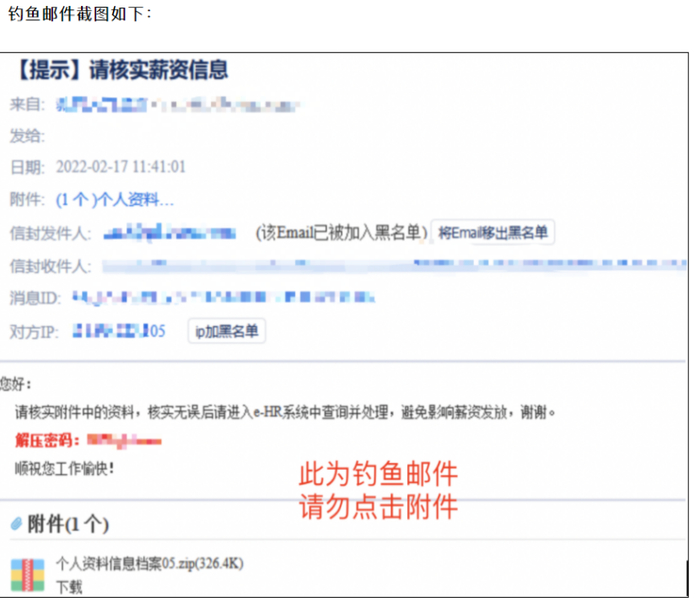 案例二也是最近某学校教职工邮箱收到的的诈骗邮件,谎称核实薪资信息并带有诈骗附件,被骚扰老师在不察之下容易上当受骗,请提高警惕!
