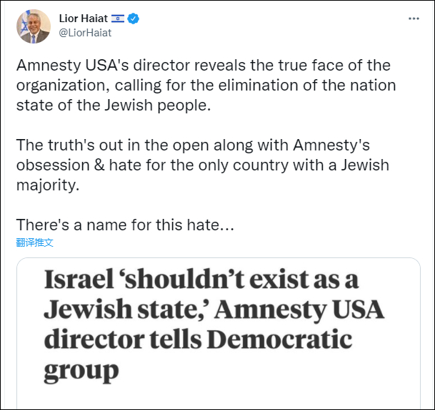 以色列外交部发言人里奥·海亚特(Lior Haiat)11日也在推特上回击了这一言论。他说:“‘大赦国际’的美国负责人揭露了该组织的真实面目:呼吁抹杀犹太人的民族国家。真相随着‘大赦国际‘对唯一一个犹太人占多数的国家的执着和仇恨而公开。这种仇恨有一个名字……”