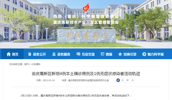 3月14日,重庆高新区新冠肺炎疫情防控指挥部办公室发布重庆高新区新增4例新冠肺炎本土确诊病例及1例无症状感染者活动轨迹。