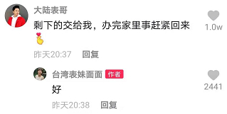 “大陆表哥”留言称,“剩下的交给我,办完家里事赶紧回来。”“台湾表妹”回复“好”。