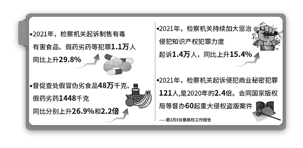 又到“3·15”国际消费者权益日。在今年两会期间,最高检工作报告中对于人民群众关切的食品药品安全、知识产权、环境保护等领域违法犯罪行为多有关注。2021年,最高检与最高法联合发布司法解释,对制售注水肉以及伪劣保健品坑老等犯罪从严追诉、从重处罚;与农业农村部等开展专项行动,重点惩治非法使用禁限用药物等犯罪。2021年,检察机关倾力服务创新发展,持续加大惩治侵犯知识产权犯罪力度,强化综合保护。
