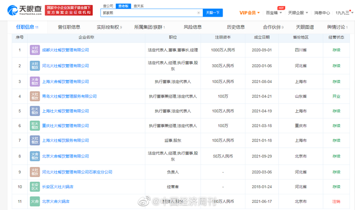 此外,邓伦还和发小们共同创立了火锅品牌“火社火锅”。天眼查App显示,河北火社餐饮管理有限公司成立于2020年1月,法定代表人及执行董事、经理均为郭家熙。不久,该公司投资成立成都火社餐饮管理有限公司。随后,成都火社公司又投资成立重庆社火、上海社火、青岛火社、上海火舍几家公司。2021年9月,同样由郭家熙担任法定代表人的北京火舍餐饮管理有限公司成立。值得一提的,上述火社火锅关联公司和邓伦并无直接关联。