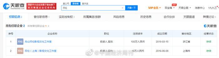 天眼查App显示,邓伦名下有2家公司,分别为邓伦(上海)影视文化工作室和舟山邓伦影视文化工作室,2家工作室均为邓伦个人独资企业,分别成立于2016年和2018年。