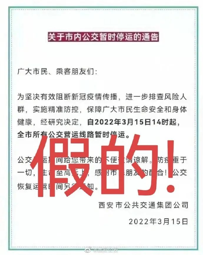 西安公安:“西安公交停运”及“西安所有小区封闭”信息不属实,为谣言!