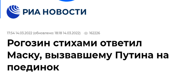 (俄新社:罗戈津用诗回应马斯克喊话普京单挑)