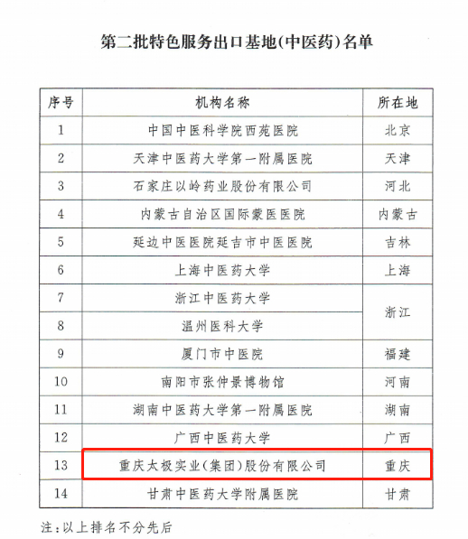 近日,商务部、国家中医药管理局联合公布第二批国家中医药服务出口基地名单,重庆太极实业(集团)股份有限公司荣获14家国家中医药服务出口基地之一,实现重庆特色服务出口基地“零突破”。