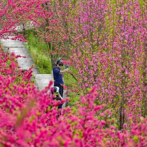 近日,在位于重庆市南岸区广阳镇大佛村的宏同生态园潘青桃基地内,桃花盛开,美不胜收,吸引众多游客慕名来到桃花林中游玩,赏桃花闻花香,与桃花亲密合影。崔景印 摄