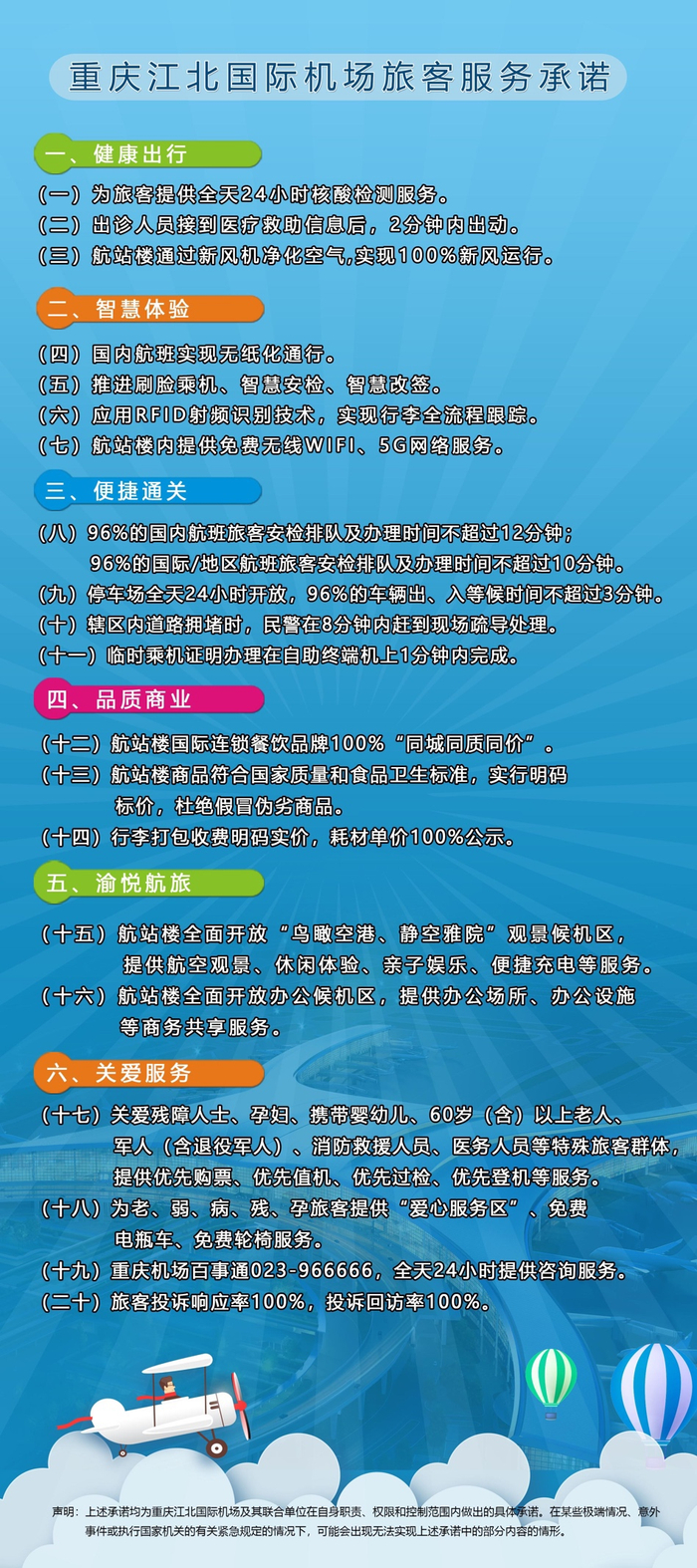 20项旅客服务承诺包含健康出行、智慧体验、便捷通关、品质商业、渝悦航旅、关爱服务等内容。服务承诺的发布,既是对《公共航空运输旅客服务管理规定》的严格落实,也是重庆江北机场为广大旅客提供优质服务的真情体现。(文字:刘敏 邹乐)
