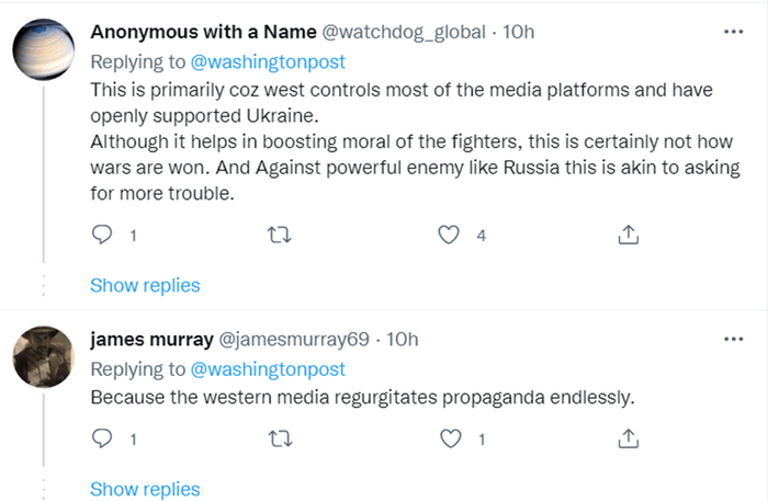 而在整个国际舆论场上,《华盛顿邮报》所说的“乌克兰在宣传上大胜俄罗斯”,也是因为俄罗斯的声音被西方合力屏蔽了。在多国政府陆续对俄罗斯开展制裁后,互联网巨头谷歌公司就封杀了俄罗斯媒体在自己下辖所有平台的展示。一些外国网民就在《华盛顿邮报》的评论区指出,推特、Facebook和其他不少社交媒体平台上,不仅大大限制了俄罗斯新闻机构的发声,甚至连个人账号转发俄罗斯媒体消息的内容,也会受到严格管控。在西方网络圈里,冲突双方只有乌克兰还能在网上发布对自己有利的消息。