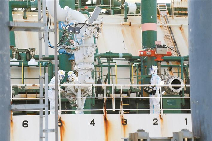 “广东大鹏LNG”工作人员正在天然气接收站码头进行卸料臂与LNG船的连接/拆卸作业,为卸气和输气提供设备保障。