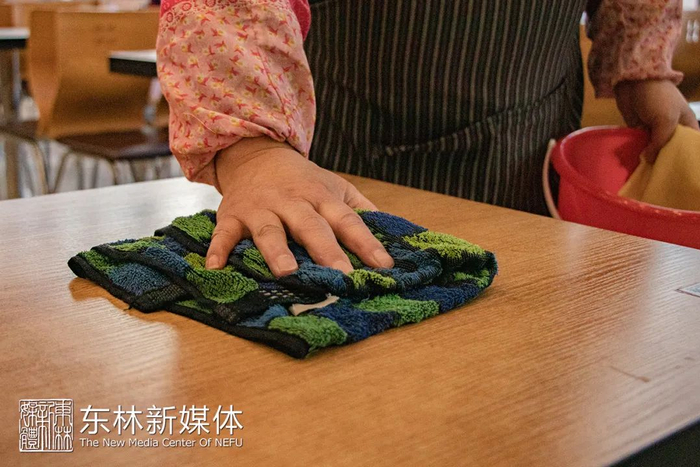 依旧辛勤地搓洗着桌子
