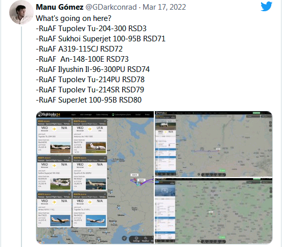 美国“航空家”网站17日称,通过在线航班追踪网站发现,隶属俄空天军和俄特种飞行中队的共计22架飞机突然集体从莫斯科附近机场起飞,飞往包括鄂木斯克、乌发、新西伯利亚和秋明等俄罗斯东南方向。