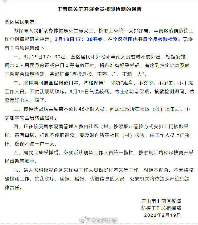 为保障人民群众身体健康和生命安全,按照上级统一安排部署,丰南区疫情防控工作总指挥部研究决定,3月19日17:00开始,在全区范围内开展全员核酸检测。现将有关事项通告如下:
